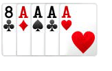 FOUR OF KIND : kartu terkuat ke 3 dalam permainan poker. Kombinasi kartu ini hanya membutuhkan 4 angka yang sama. Misal : As♦ ¨C As♥ ¨C As ♠¨C As ♣ ¨C 10 ♣ atau 8 ♣ ¨C 8♦ ¨C 8♥ ¨C 8 ♠¨C 1♦