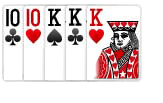 ROYAL FLUSH : kombinasi kartu ini adalah tingkatan tertinggi dalam permainan Poker, angka pada kartu harus berurut dengan angka tinggi, yaitu 10 ♠¨C J ♠¨C Q ♠¨C K ♠¨C As ♠dengan bunga yang sama (tidak boleh beda), contoh lain : 10 ♥ ¨C J ♥ ¨C Q ♥ ¨C K ♥ – As ♥